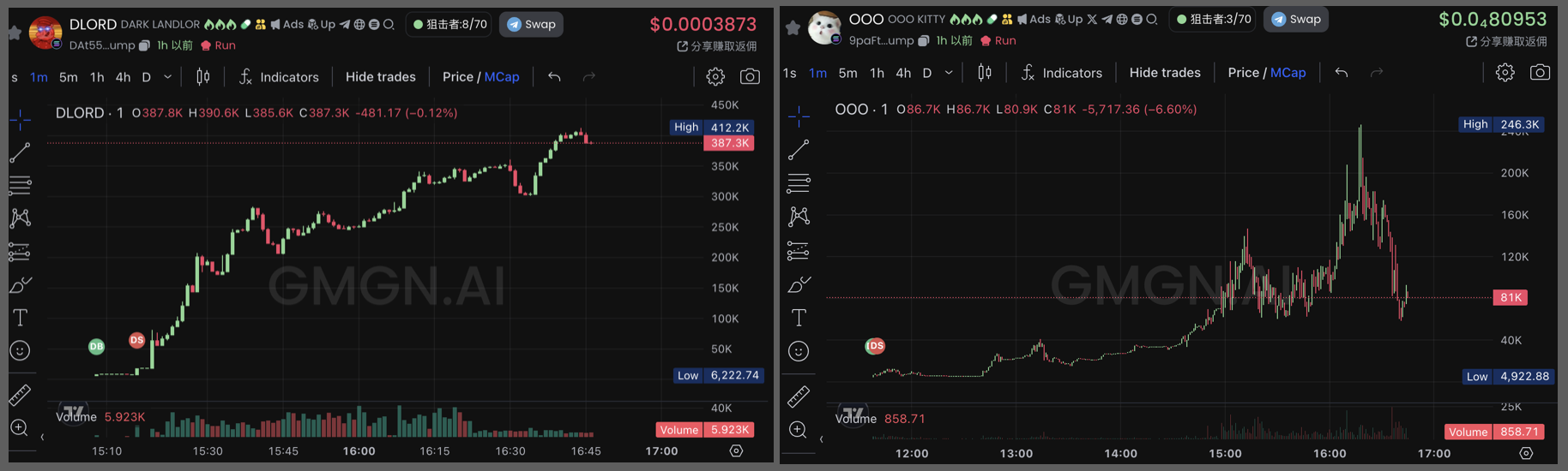 四个月前,以太坊上的土狗市值如果低于 1M美元,大部分人会推测代币共识松散、团队过于「草台」而不敢下手。但在 Solana 上,凝结到刚好能赚钱的共识所花的成本和时间要小得多,于是猎手与猎物的区别就只在几分钟之间。