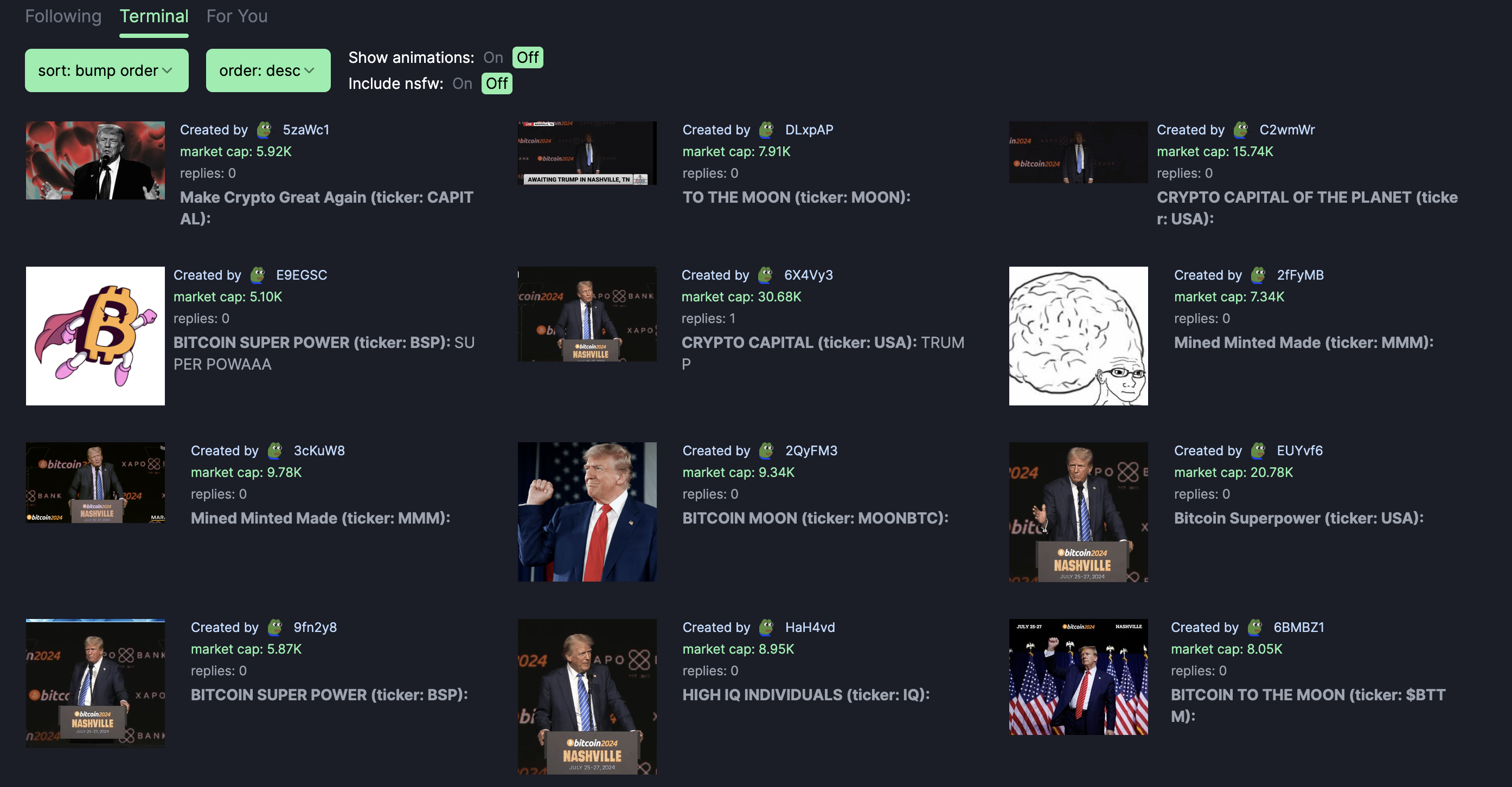 「注意力是最重要的,特朗普出新闻肯定都有跑出来的币。」陆奇自那之后产生了这样的判断。前几日,特朗普作为第一个美国前总统在纳什维尔在比特币 2024 大会上作演讲期间,meme 玩家从从推迟出席到全程蹲守到做完演讲,在 Pump.fun 上实时蹦出各种关键词代币中寻找下注标的。而在几十个相关 meme 币中,没有一个市值超过 500K。