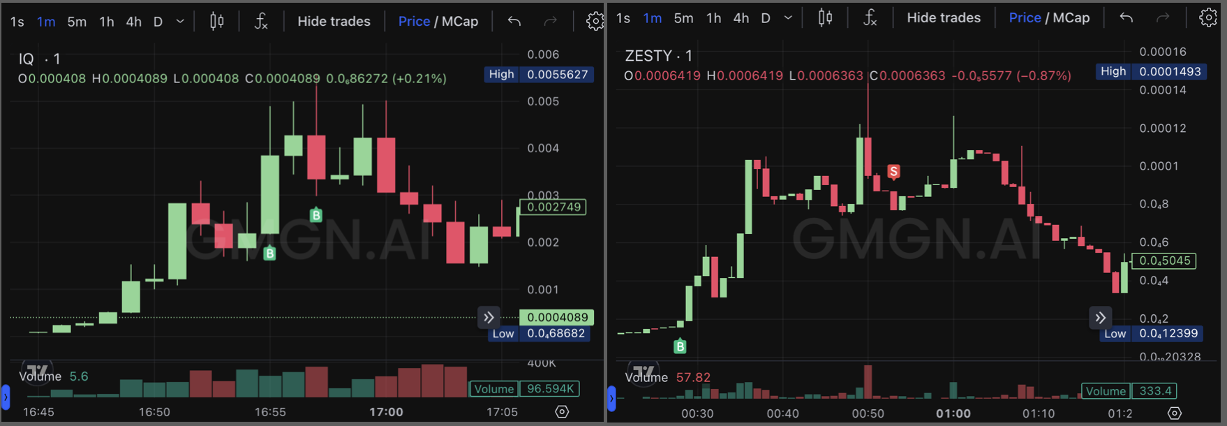 一个交易者在 meme 币 ABDUL 和 MUMI 上的交易记录,最高市值分别为 247.5K 和 483.5K