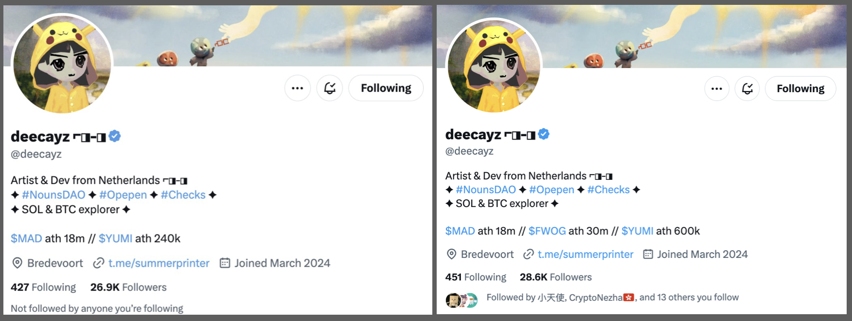 昨日,原本因仿盘而不被看好的 FWOG 达成了 7 小时涨幅 50 倍、交易量超 6000 万美元的成就,其 CTO 团队 caller @deecayz 的推特账号头像正是 Milady,他在 bio 上展示了曾经 CTO 成功的两个 meme 币。