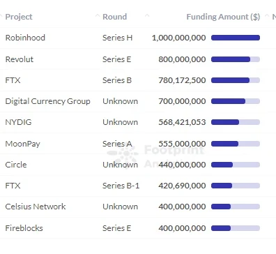根据 Footprint Analytics, 2021 年共发生 1045 笔融资,总融资额达 302.7 亿美元,相较于 2020 年增长率高达近 790% 。具体项目的融资规模而言,股票经纪公司 Robinhood、交易所 FTX 以及应用服务平台 Revolut 排名 CeFi 领域前三;去中心化自治组织 BitDAO、资产交易平台 FalconX 以及去中心化聚合交易所 1inch 排名 DeFi 领域前三。