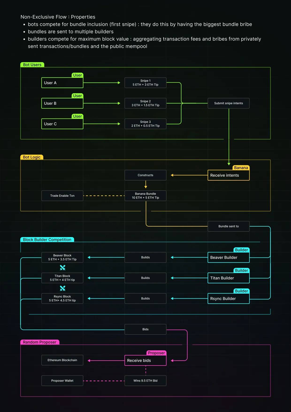 首先,TG Bot 为用户提供的不仅仅是狙击服务,还有普通的买卖交易,包括链上的限价单。然而,Banana 的商业模式主要根植于其「狙击」叙事。其高额的区块 0 贿赂文化推动了其强劲的收入流。因此,Banana 的商业模式是基于向用户保证,他们将在任何竞争对手之前进入代币交易。通常,为了最大化区块 0 贿赂捆绑在链上成功的机会,这样的发起者会将其用户的捆绑发送给以太坊上的所有领先构建者。