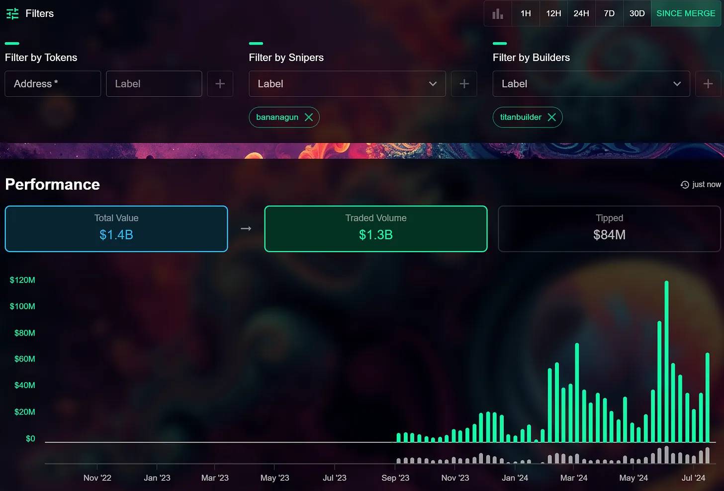 对 Banana Gun 路由器交易的分析显示,Banana 团队在大多数时间里将其狙击捆绑专门通过 Titan Builder 路由。