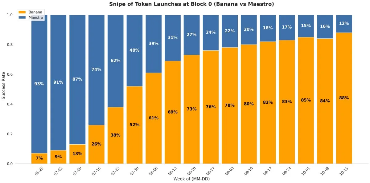 Banana Gun 的这一策略非常有效,以至于在 2023 年 6 月到 10 月期间,与行业领先的 TG Bot「Maestro」(自 2022 年中期运营)相比,Banana Gun 用户的「区块 0」主导地位从 7% 上升到在 TG Bot 领域赢得了 88% 的第一批捆绑包。