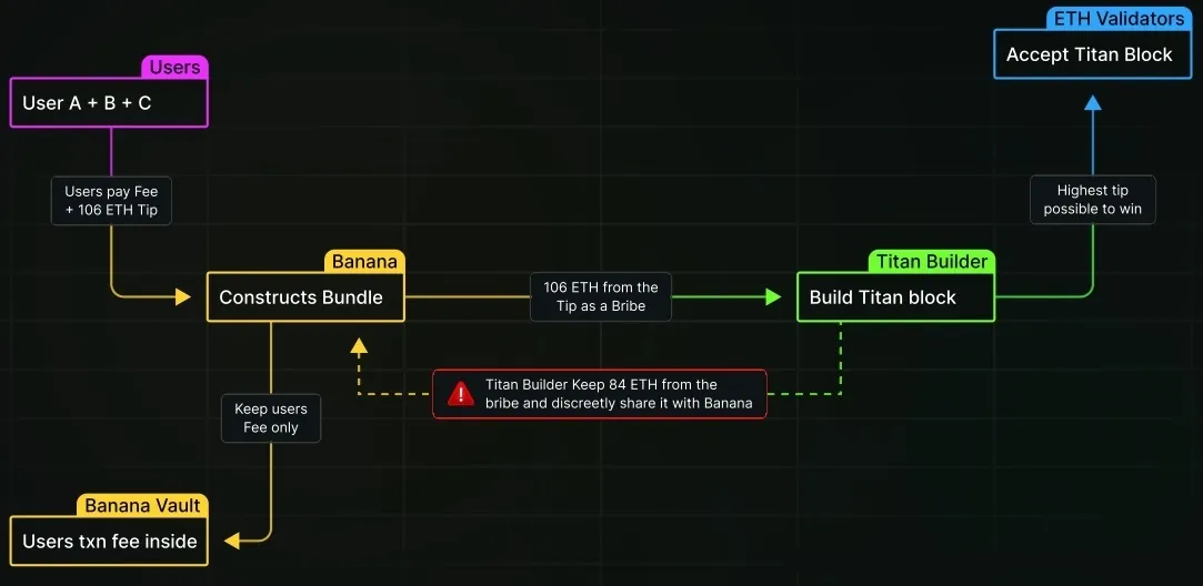 这篇论文支持了我在回顾 2023 年 12 月至 2024 年 3 月之间以太坊链上超过 3500 个区块时的初步计算,其中 Banana 区块 0 捆绑几乎专门通过 Titan Builder 路由。这表明,在 Banana 用户为将他们的狙击交易上链支付的总额 4466.89 ETH 中,仅有 2915.65 ETH 被转移给以太坊提案者,而 2271.26 ETH 被 Titan Builder 独占。即便假设 Banana 和 Titan 之间的私人 EOF 按 50-50 分配,也可以推测在此期间有 1135.63 ETH 被送回 Banana Gun 团队的私人账户。这些将是未申报的利润,金额高达数百万美元,来自那些被 Banana Gun 团队引导进入高贿赂文化的无辜用户。