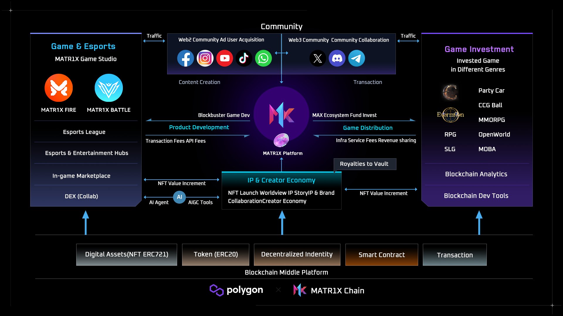 简单来说,Matr1x 统包了 Web3 游戏产业的上、中、下游各个环节,从游戏的打磨、出版、运营、技术提供、社群运营到电竞生态与 IP 衍生品,皆可以透过 MATR1X 平台来包办。