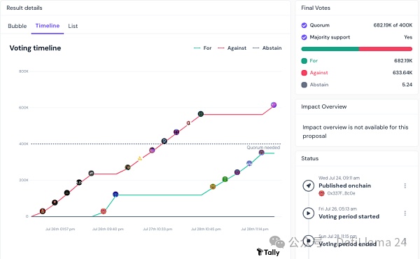 以下 Tally 快照展示了投票时间线。它未能捕捉到提案投票的最后一刻激增。