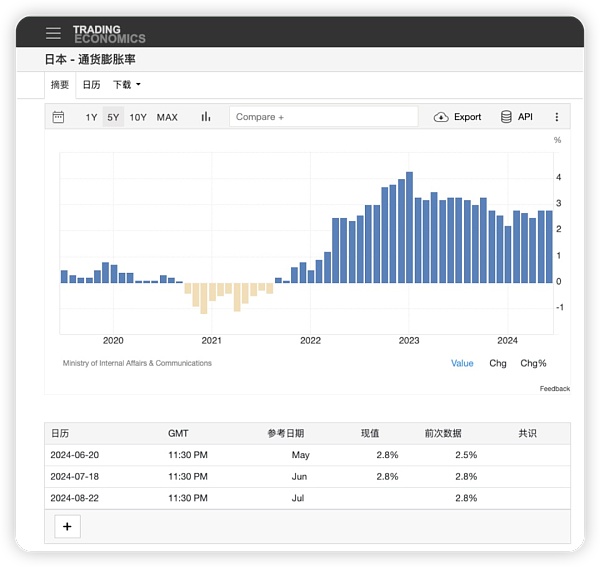 但是另一方面,另一个套息交易路径的存在,大量的日元被兑换成了美元,用于购买美元资产,这就造成了日元对美元进入了长期的贬值趋势,从2021年到2024年,美元对日元价格从最低103,一路上涨到160,日元贬值幅度超过60%,但是考虑到货币汇率的波动对于本国国民的获得感其实并没有如此强的影响,所以即是在这样的贬值之下,日本国内通胀也在有条不紊的增长。