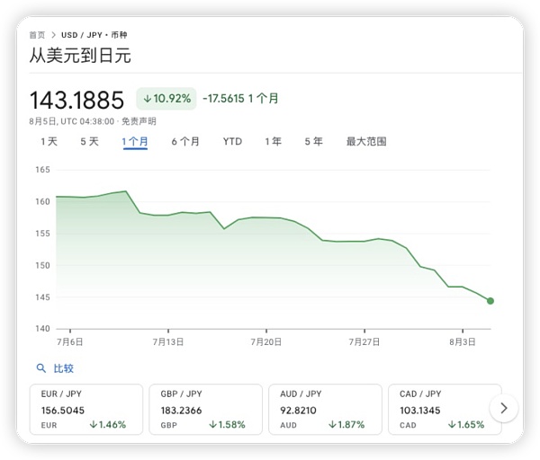 但是不管原因如何,这种对立在上周三日本央行正式加息15个BP,远超市场预期而结束。至此市场正式迎来了反转,首先可以看出美元与日元汇率从160快速拉升到截止撰文时的143,至此日元套利交易也正式迎来了终结,大量的交易员开始了拆平仓操作。这就带来了大量美元计价的风险资产被卖出,然后换成日元偿债。
