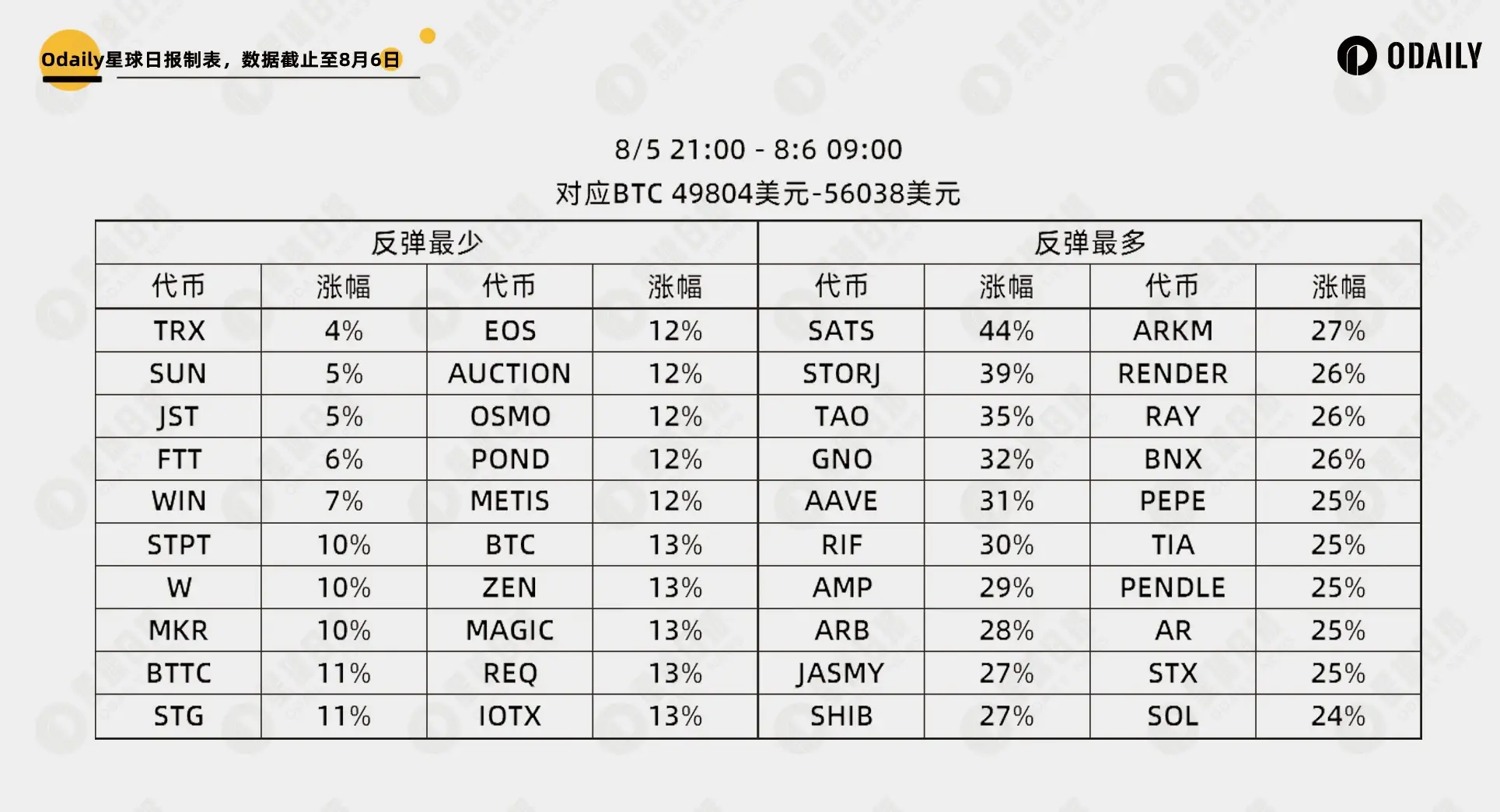 以 8 月 5 日 21 时作为基准,以其开盘价作为涨幅起点,以 8 月 6 日 9 时作为统计终点,以时段内的最高价作为涨幅终点,数据如下表所示。