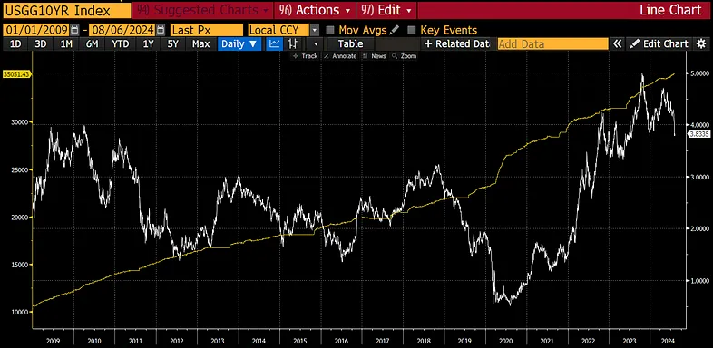 美国未偿还债务总额(黄色)在右上方。然而,10 年期国债(白色)收益率一直处于区间波动,与不断增长的债务几乎不相关。