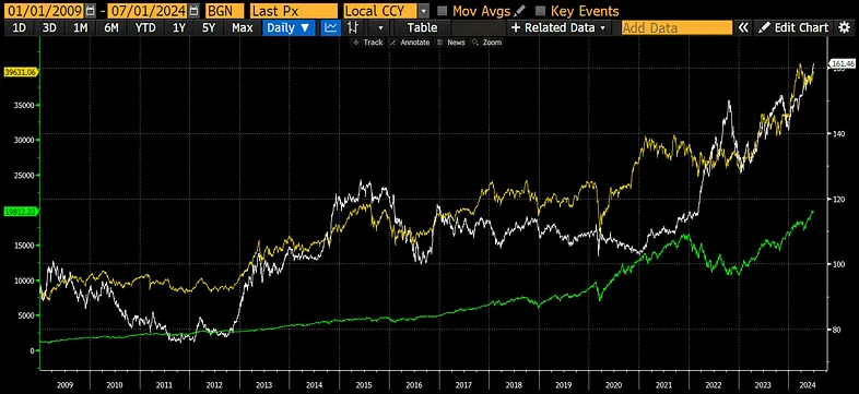 美元兑日元 (白色) 上涨,这意味着日元兑美元走弱。纳斯达克 100 指数 (绿色) 和日经 225 指数 (黄色) 也随之上涨。