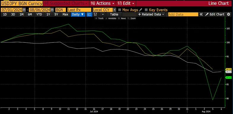 我对日本公司套利交易头寸进行协调救助的假设基于这样的信念:哈里斯不会因为一些外国人决定退出一些她可能根本不了解的交易而让自己的当选机会减弱。她的选民当然不知道发生了什么,也不关心。他们的股票投资组合要么上涨,要么没有上涨。如果没有,他们就不会在选举日出现投票给民主党。投票率将决定小丑皇帝是特朗普还是哈里斯。