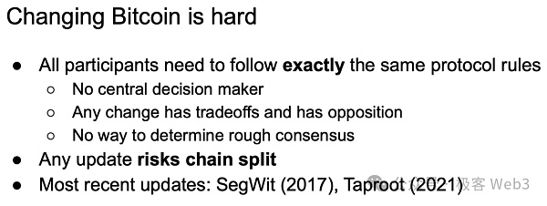 其实有很多技术手段可以解决比特币身上存在的问题,但为什么直到今天,这些技术仍没有被加入到比特币协议中?这是因为比特币协议很难被修改。比特币生态里没有类似于以太坊基金会的组织,对协议的任何修改都需要社区达到高度共识才行,这里涉及到大量的博弈和权力制衡,所以不同于以太坊那样每年都会有EVM操作码的更新,比特币协议自问世以来,变更就非常少。