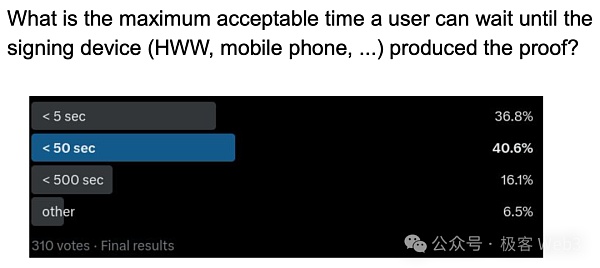 我做了一个小调查,询问用户能接受的签名设备生成证明的最长延时,许多人可以接受较长的等待时间,特别是能获得显著收益的时候。所以如果我们将ZK引入比特币交易中,似乎也没有太多麻烦。