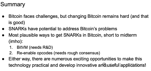 比特币社区许多人对SNARK/STARK的潜力感到兴奋。在中长期内实现SNARK验证的最可行方法,很大概率是BitVM,但它需要更多的研发投入才能在实践中发挥作用;