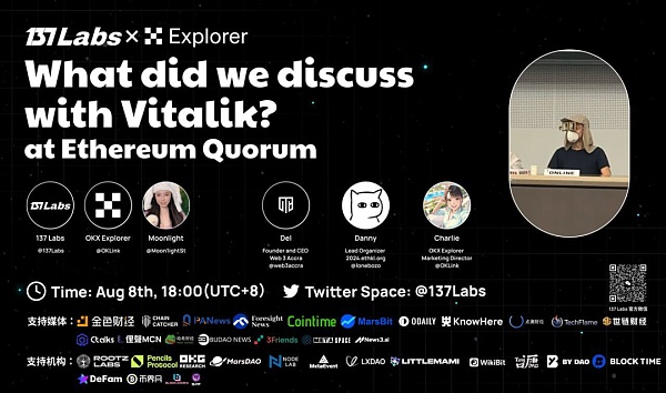 8月8日18:00(UTC+8)137Labs 联合 OKLink 邀请了参与闭门会议的非洲、亚洲代表以及OKLink的代表进行了Ethereum Quorum 相关内容的SPACE分享,这也是此次闭门会议内容的首次公开分享,SPACE获得了20K+的收听。以下是文字内容: