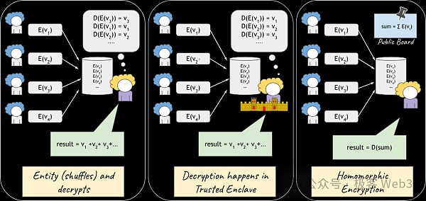 而在最右侧的图中,使用了同态加密技术:加密后的投票数据可以被公开加总求和,然后再解密得到结果,算出最终的投票数