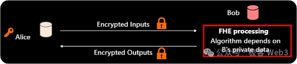 在FHE两方计算的模式中,唯一的区别在于Bob会在计算过程中贡献一些私密数据,也就是把自己的私密数据加入到FHE计算过程中。在这种情况下,FHE是很好的两方计算解决方案,具有最小的通信复杂度,并可以通过其机制设计提供强有力的保证:Bob不会窥探到Alice的私密数据,而Alice也不会窥探到Bob的私密数据。