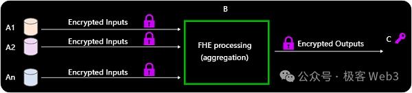 综上,为了应对上述场景,我们可以引入全同态加密(FHE)技术。FHE是一种特殊形式的加密方案,允许在不解密密文的情况下直接对密文进行函数计算,获得该函数输出的加密后的结果,这样就可以保护隐私。