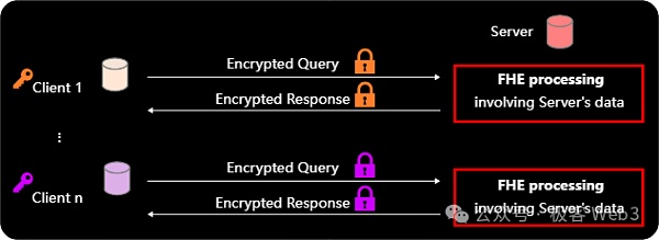 这种模式是对前面提到的双方计算模式的改进,其中服务器会为多个拥有独立密钥的客户端提供FHE计算服务。FHE可以用于私有AI模型运算服务,例如,客户端有私密数据,服务器端有私有的AI模型或服务)。服务器拥有的私有AI模型是以明文形式存储在本地的,然后每个客户端都有自己的私密数据,希望放到AI模型中进行运算。最终每个客户端可以使用自己的密钥解析出自己所提交数据的运算结果。