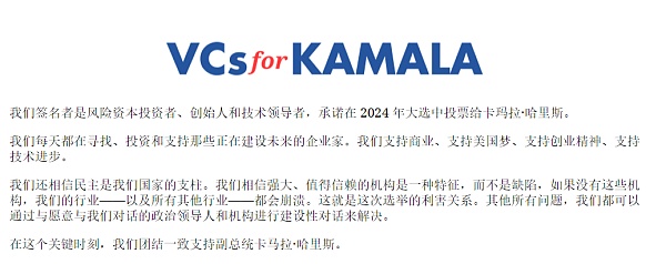 硅谷发起卡马拉支持活动,来源vcsforkamala官网