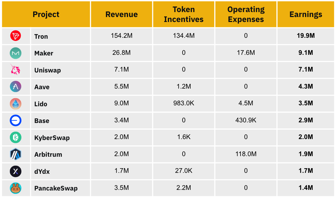 依据最近 30 天的数据,盈利能力领先的协议(在 Token Terminal 的样本数据集内)是 Tron、Maker 和 Uniswap。