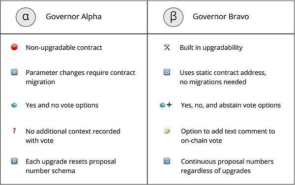 参数变更:Governor Bravo 引入了方便地调整某些参数的功能,如法定人数、提交阈值、投票期限和时间锁定期。这种可调整性有助于改善治理风险管理,而这是 Alpha 所缺乏的。