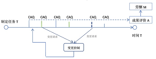 成果的评价分布在任务的每一个里程碑节点,最终使用加权形成。最少进行规划期、执行期、交付期三次评价。可以采用 CAQ 步进评价法,从以下三个维度进行: