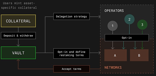 Vaults: 管理存放的抵押品代币。他们负责将代币委托给操作员,并根据预定义的协议实施奖励和惩罚机制。Vault通常由操作员根据他们从网络接受的条款创建。