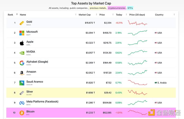 都始于一切比特币。自诞生以来,加密货币行业经历了无数的发展和变化,但比特币仍然是整个行业的标杆。截至撰稿,比特币的市值已达到 1.2 万亿美元,在所有资产类别中中排名第十。而随着现货ETF的批准,比特币进一步巩固了其“数字黄金”的地位。比特币能够实现1.2万亿美元市值的原因并非是一门以营业利润为基础的商业,而它被认为是一种具有稀缺性和合法性的资产。即使是世界上使用最广泛的支付网络Visa和万事达卡,其市值也不及比特币的一半。