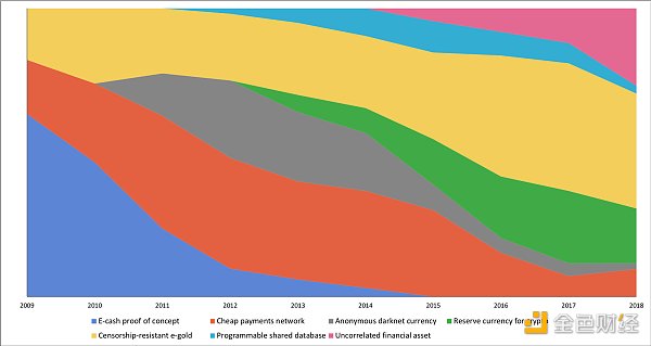 比特币并非从一开始就被视为“数字黄金”。早期,大多数人认为比特币是一种新的电子货币或低价支付网络。2010年代初,人们还普遍认为比特币是一种黑暗然而,随着时间的推移,比特币逐渐获得了合法地位,其叙述方式也从交易价值转变为价值存储。上图的后半部分,即2018年同期,明确表明公众舆论更倾向于将比特币作为一种资产类别,而不是支付网络。虽然上图没有显示2018年以后的数据,但关于比特币「数字黄金」的论调不仅一直存在,而且还在不断加强。