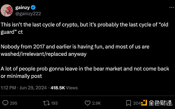 与之前的熊市相比,市场已经明显复苏。然而,在复苏的同时,行业内也出现了突破的两极估值。就memecoin而言,一方面,反对者称其是毫无意义的投机行为,而者则认为其代表的创新正在「走向支持市场」(Go-To-Market),是焦点经济新兴模式的衍生物。另外,就叙述而言,行业也分为了两派,一派赞扬新的叙述方式和基础设施的演变,另一派则属于精英主义领域。