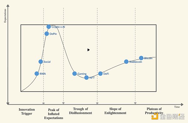 另一方面,对于更广泛的用户群体来说,在一些领域的应用还很有限。NFT 似乎正在经历一场「幻灭」。在经历了 2021 年的牛市之后,除了少数几个核心 IP 外,大大多数 NFT 项目都未能获得社会的青睐。此外,即使市场对游戏寄予厚望,但该成绩的成绩也不容乐观,大受冷落用户。至于其他情景,如人工智能、DePIN 和社交,或尚未达到炒作的顶峰,或者只是一个创新的起步阶段。