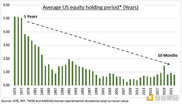 对于投机的偏好并不局限于加密货币,这是一种社会现象。不断加深的经济不平等和社交媒体影响下人们注意力持续时间的缩短,促使人们对投资资产的风险承受能力不断提升。20 世纪 70 年代,美国人的平均持股时间为 5 年,而到 2020 年,这一数字下降到 10 个月。