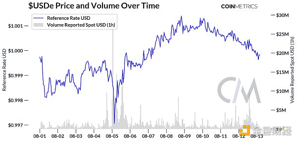 USDe 是Ethena 在以太坊区块链上创建的合成稳定币产品。与由法定货币储备支持的传统稳定币不同,USDe 依靠不同的方法来维持与美元的挂钩。USDe 依靠质押 ETH 和做空永续期货来产生美元中性投资组合的收益,从而创建了一种“合成美元债券”,它跟踪美元,同时提供至少部分原生于以太坊区块链的收益。我们可以在下图中看到 USDe 在 8 月最后几天的价格活动,注意到市场将挂钩汇率保持在 1 美元面值的 0.3% 以内。