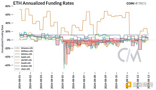 关于 USDe 的主要担忧之一是其对中心化控制的依赖以及由此带来的潜在脆弱性,尤其是持续的正融资利率要求,这对于其与美元挂钩的可持续性至关重要。然而,在周末的市场调整中,大多数 ETH 期货市场的年化融资利率都为负值,尽管到 8 月 13 日,除少数例外,大多数市场的融资利率都为负值。