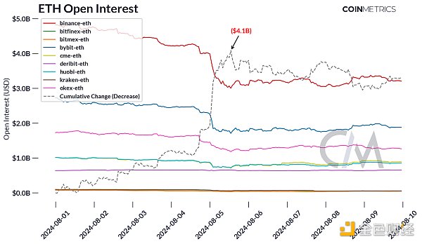 持仓量的减少通常伴随着或伴随着标的资产价格大幅波动或抛售,因为交易者变得更加厌恶风险并平仓杠杆头寸。持仓量的减少可以洞悉整体市场情绪和未来价格走势的可能性。在下图中,我们可以看到,以灰色虚线衡量的持仓量减少了约 41 亿美元。