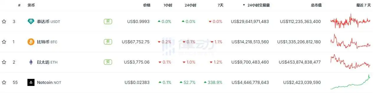 6 月 3 日,据 CoinGecko 行情信息,NOT 24 小时全网交易量达 46.46 亿美元,仅次于比特币、以太坊和 USDT,位列全网交易量排名第四。
