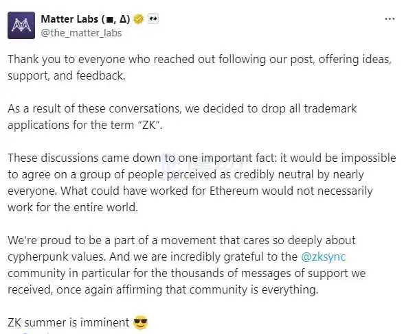 6 月 3 日,据官方消息,zkSync 背后的实体公司 Matter Labs 决定放弃对「ZK」一词的所有商标申请。