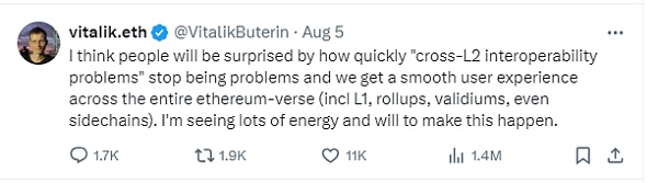 Vitalik Buterin:我认为跨 L2 的互操作性问题「很快就会不再是问题」,整个以太坊(包括 Layer1、Rollups、Validium,甚至侧链)都会获得流畅的用户体验,这将会让人们大吃一惊。我看到了实现这一目标的巨大能量和意愿。