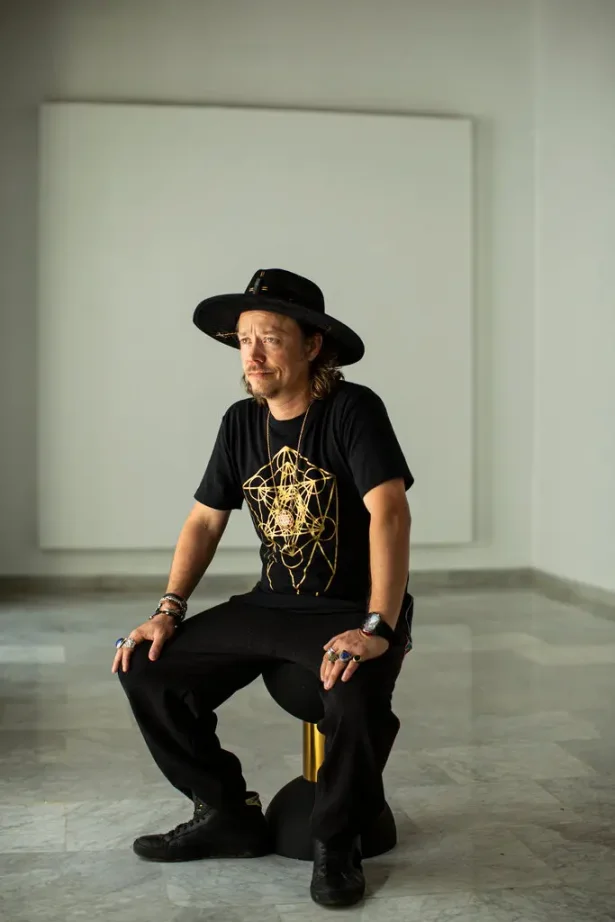 Pierce 全身穿着黑色衣服,戴着一顶黑色的帽子,坐在白色房间里的凳子上