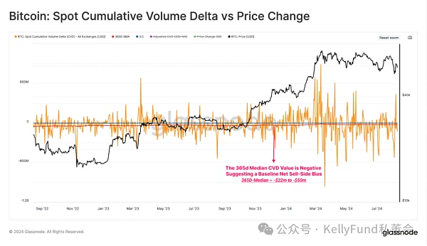当我们分析现货CVD的年度中位数时,我们可以看到,在过去的两年中,这一指标在-2200万美元和-5000万美元之间波动,表明市场明显偏向净卖方。