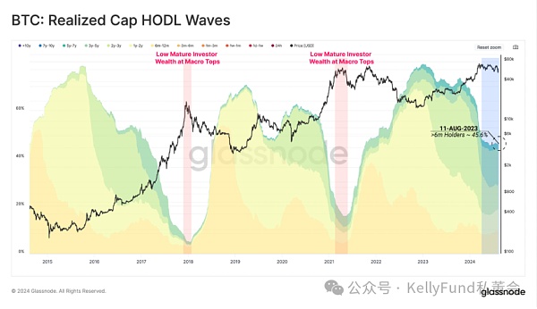 与过去周期中,比特币价格突破历史峰值之后的情况相比,目前在全网资产中,由长期持有者持有的比例相对较大。