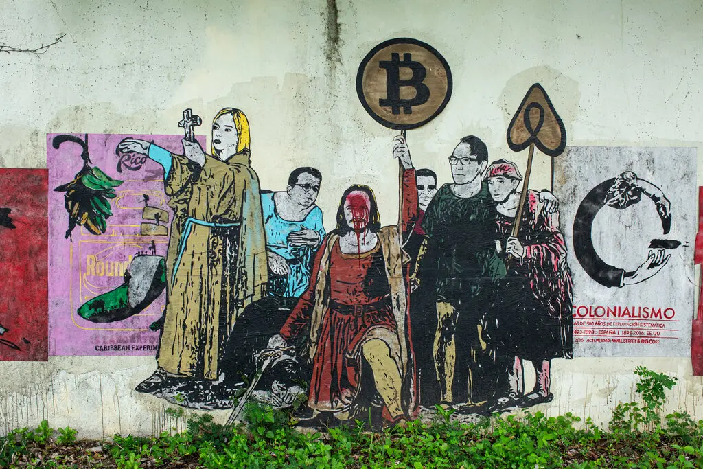 随着 Pierce 和其他富豪移民的到来,波多黎各居民看到了新的裂痕,房价飙升,尤其是在沿海城镇,这迫使当地家庭流离失所。在 W 酒店外的一面墙上,一群当地艺术家画了一幅壁画,画中 Pierce 身着深红色束腰外衣,手拿一个比特币 Logo 的符号,标题写道:「殖民主义」。