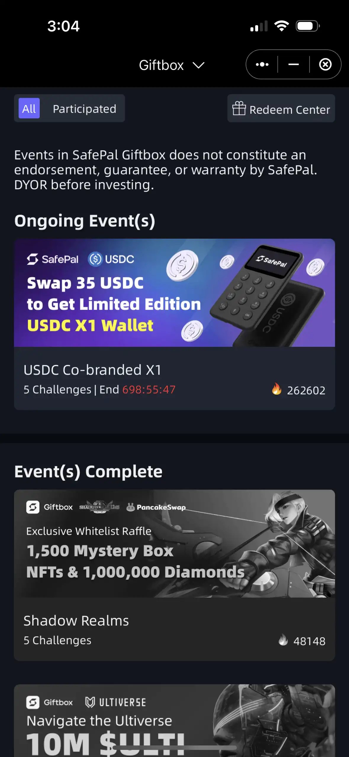 9. 空投中心 QuestHub:主要是其它的生态项目到 SafePal 来做的空投活动,分 WHO 和 Giftbox 两种,WHO 的活动主要都是一些上币前的项目,通过白名单和完成指定任务后能获得项目方的早期空投。白名单任务主要包括持有硬件钱包或是有钱包里的交易行为等。Giftbox 的参与门槛通常较低,活动数量也会远超 WHO。最近,空投中心上了与 Circle 合作的 USDC 限量定制硬件钱包免费送的活动,大家也可以来撸。之前上的活动项目方还包括币安、Ultiverse、PancakeSwap、Injective、Stader 等比较知名的项目,这个版块属于撸毛用户必备。