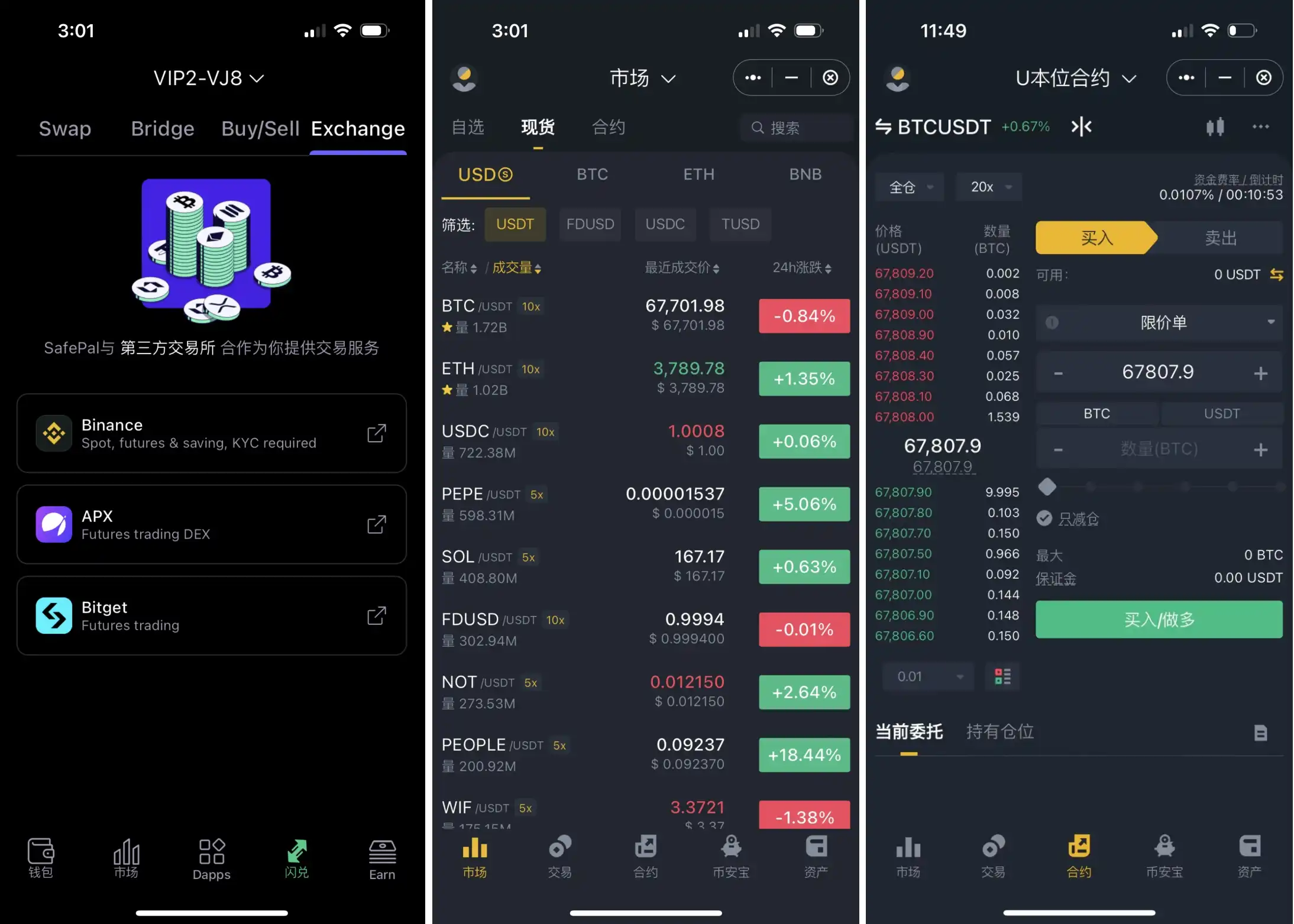 4. 交易所小程序:SafePal 聚合了币安、Bitget 等交易小程序,交易费率和交易所平台没有差别,用户可以在钱包里直连多个交易所账户,这个在其它钱包里比较少见,而且从交易所小程序充币、提币的时候可以选择直接选择提到 App 里的其中一个钱包账户,不用担心复制错地址,体验很丝滑。
