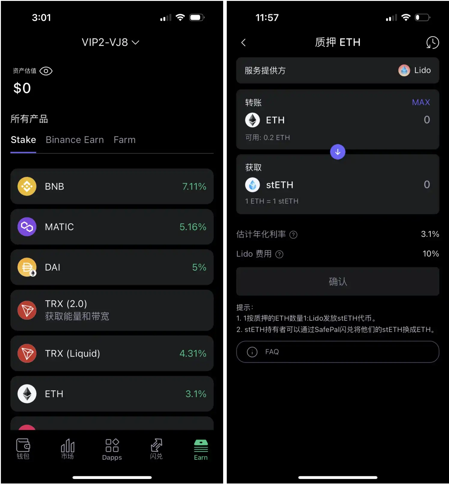 5. DeFi 理财:除了可以汇总展示用户在链上 DeFi 协议上参与质押的资产类型和金额以外,SafePal 还提供了适合懒人和小白的理财聚合器,目前有 DeFi 质押、币安宝、DeFi 挖矿机枪池 3 大类,但是支持的协议还不算太多,比如最近很火的 restaking 重质押协议支持得就不是很全,体验有待改进。