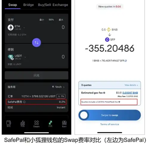 2. Swap 币币兑换:SafePal 聚合了去中心化和中心化的跨链交易通道,自动推荐最优价格的通道。支持的币种不少,除了主流的 BTC、ETH、SOL、BNB、MATIC 等币种外,像 Babydoge 这样的 meme 币也有。费率展示透明,小编亲测了 ETH/USDT 的币对,费率比小编看到过的绝大多数钱包都低,跟小狐狸钱包的费率比只是后者的不到四分之一。