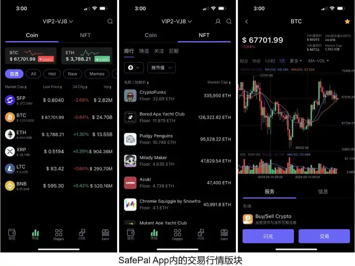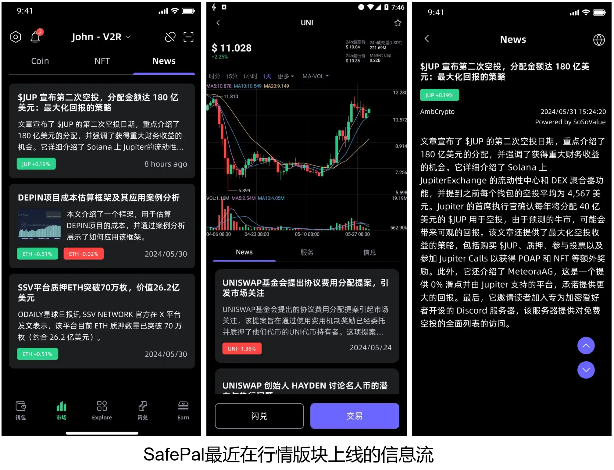 3. 交易行情+资讯信息流+AI 播报:SafePal App 里的「市场」版块支持查看代币和 NFT 的实时行情,包括币种的基本信息、K 线、NFT 的地板价、最近成交、巨鲸动向追踪等。最近还上线了动态资讯信息流,聚合了国内外各大媒体和社区 KOL 的一手信息和观点,方便了解不同项目的最新动态、解锁信息等。而且 App 里内置了 AI 自动中文播报,方便利用刷牙、上厕所、通勤这样的碎片时间了解行情动态,对重度炒币用户或投研用户友好。